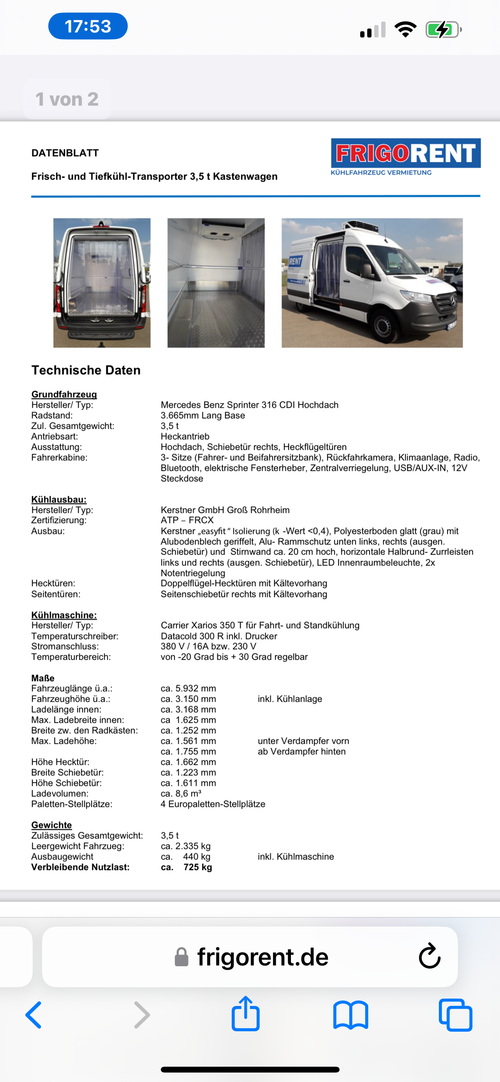- Zul. Gesamtgewicht: 3,5to Fahrerkabine: 3- Sitze (Fahrer- und Beifahrersitzbank), Rückfahrkamera, Klimaanlage, Radio, Bluetooth, elektrische Fensterheber, Zentralverriegelung, USB/AUX-IN, 12V Steckdose Innenmaße Laderaum: ca. 3.168 x 1.625 x 1.755 (mm) Schiebetür rechts, Heckflügeltüren Kälteanlage: Temperaturschreiber inkl. Drucker 230V Stromanschluss inkl. Kabel